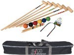 Jeu de croquet pour 6 personnes: 6 maillets en bois massif,longeur 100 cm adaptés aux adultes, 6 boules en bois (diamètre 70 mm chacune), 2 piquet de départ / arrivée en bois, des instructions multilingues , 10 arceaux en métal, sac de transport en polyester robuste et pratique.