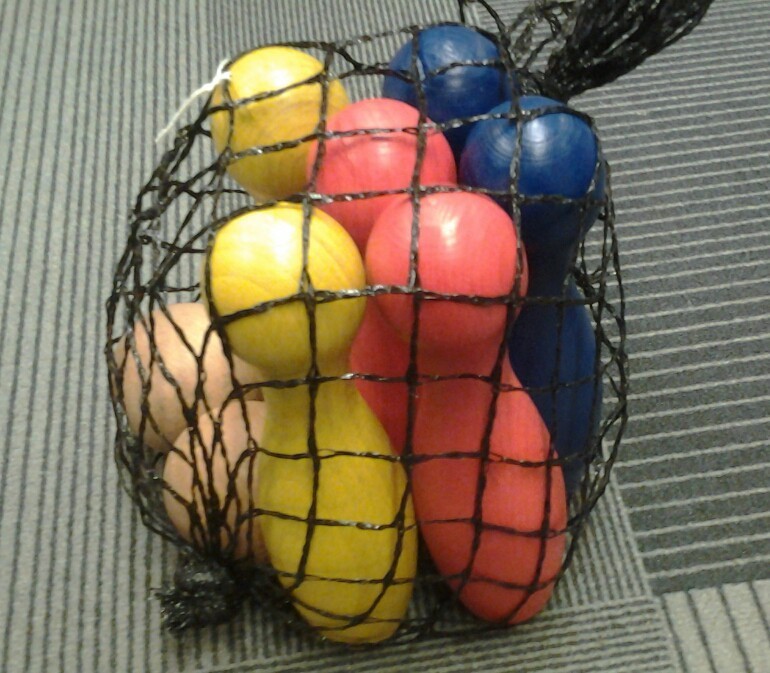 6 quilles de bowling + 2 boules en bois 60mm (le tout fournit avec un filet)Couleur : bleu, rouge et jaune